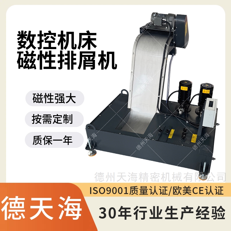 磁性排屑机通过永磁材料的强磁场吸附铁屑,并将其输送至集屑箱。其磁板或磁辊可以吸附颗粒状、粉状及长度≤150毫米的切屑,同时分离切削液中的碎屑。适用于铸铁碎屑、齿轮机床落屑等场景,尤其适合湿式加工中含油污的排屑需求。