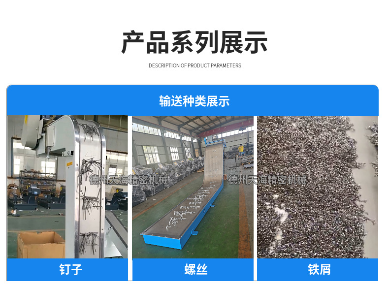 板式 和 辊式 结构,采用封闭设计确保排屑均匀。链板材质有不锈钢和优质炭钢,防止细屑粘附。定量排屑机制配合自动涨紧链条,保障运转平稳,寿命长达十年以上